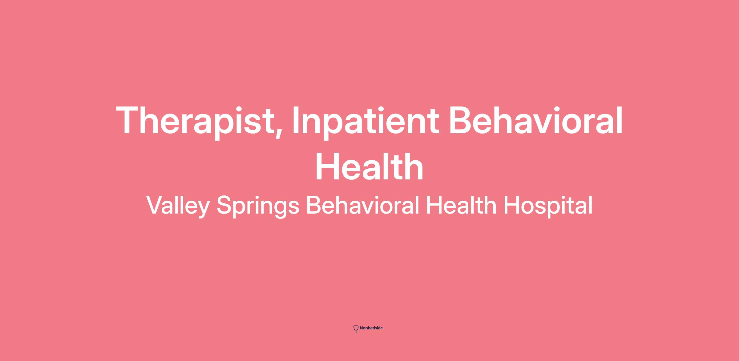 Valley Springs Behavioral Health Hospital is operated jointly with Lifepoint Behavioral Health and Baystate Health. We are driven by a profound commitment to prioritize your well-being so you can provide exceptional care to others. As an Inpatient Therapist joining our team, you're embracing our promise to provide superior patient care that exceeds industry standards as well as patient expectations. Join us on this meaningful journey where your skills, compassion and dedication will make a remarkable difference in the lives of those we serve.