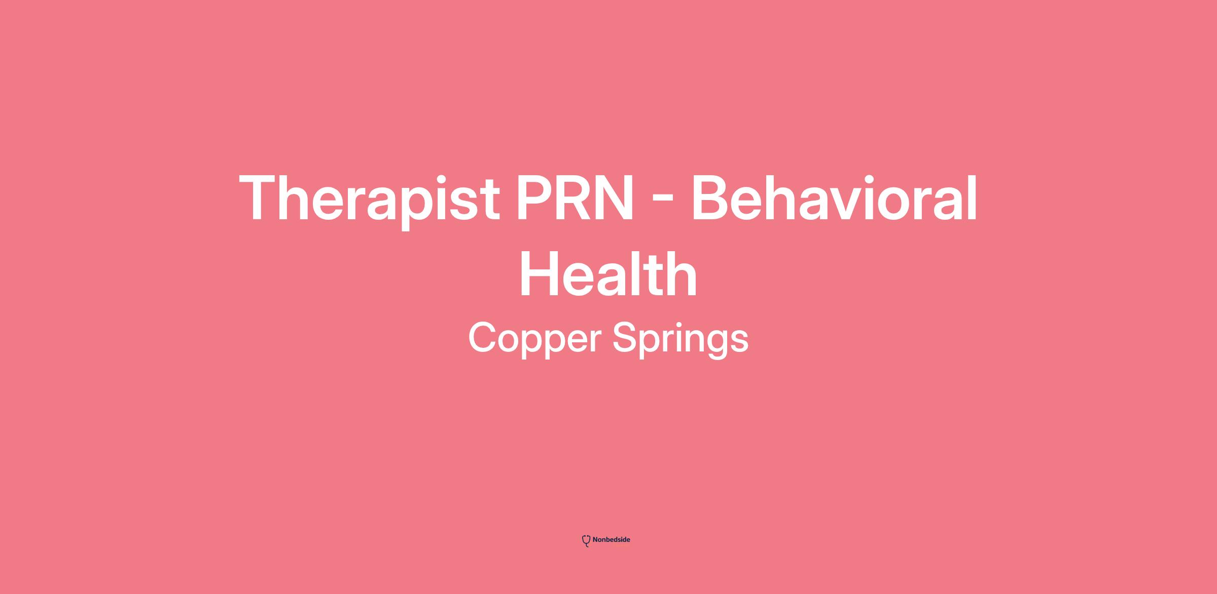 Copper Spring is part of Lifepoint Health, a diversified healthcare delivery network with facilities coast to coast. We are driven by a profound commitment to prioritize your well-being so you can provide exceptional care to others. As a Therapist - Behavioral Health joining our team, you're embracing a vital mission dedicated to making communities healthier ®. Join us on this meaningful journey where your skills, compassion and dedication will make a remarkable difference in the lives of those we serve.