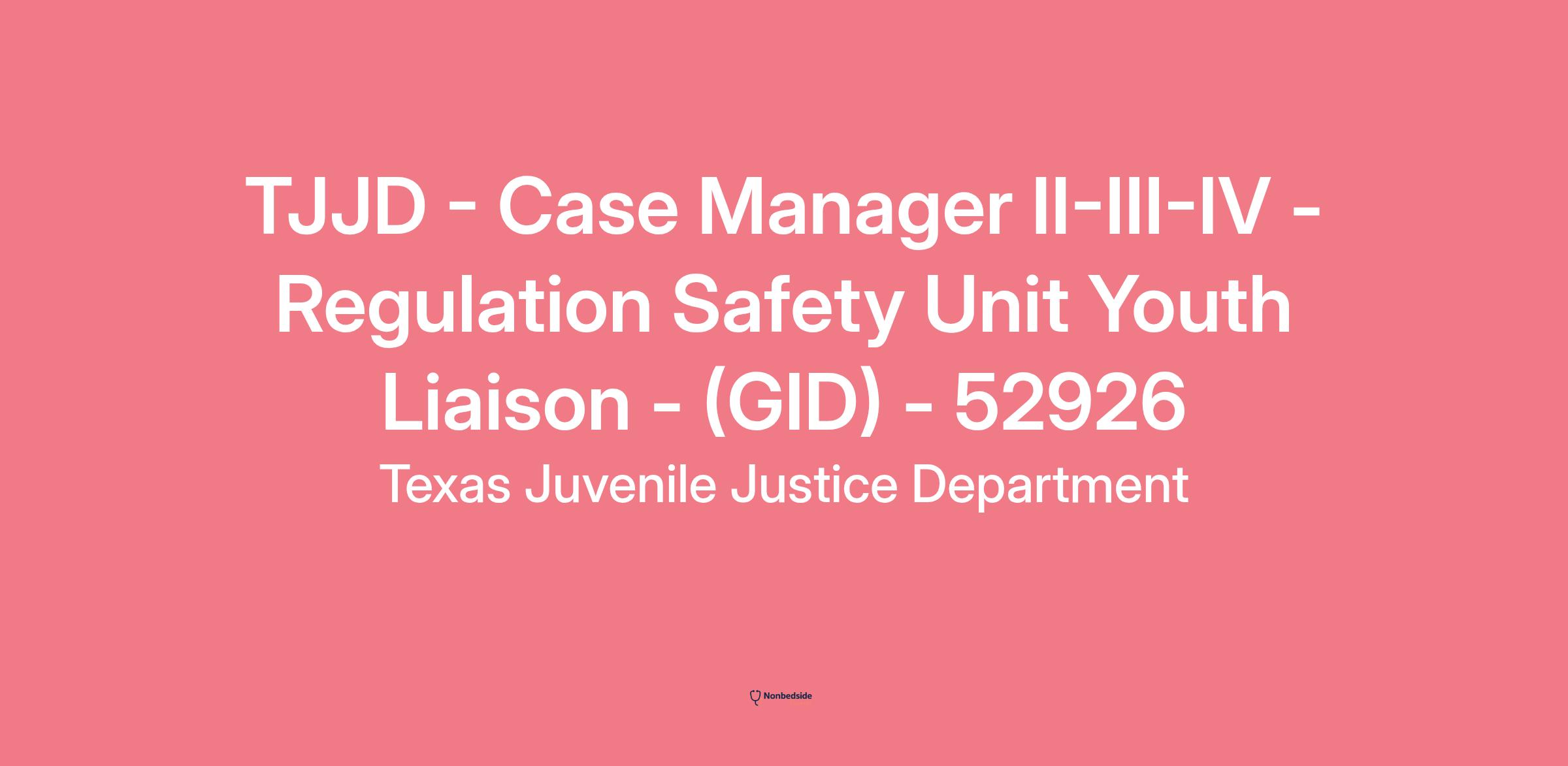 Overview Join to apply for the TJJD - Case Manager II-III-IV - Regulation Safety Unit Youth Liaison - (GID) - 52926 role at Texas Juvenile Justice Department