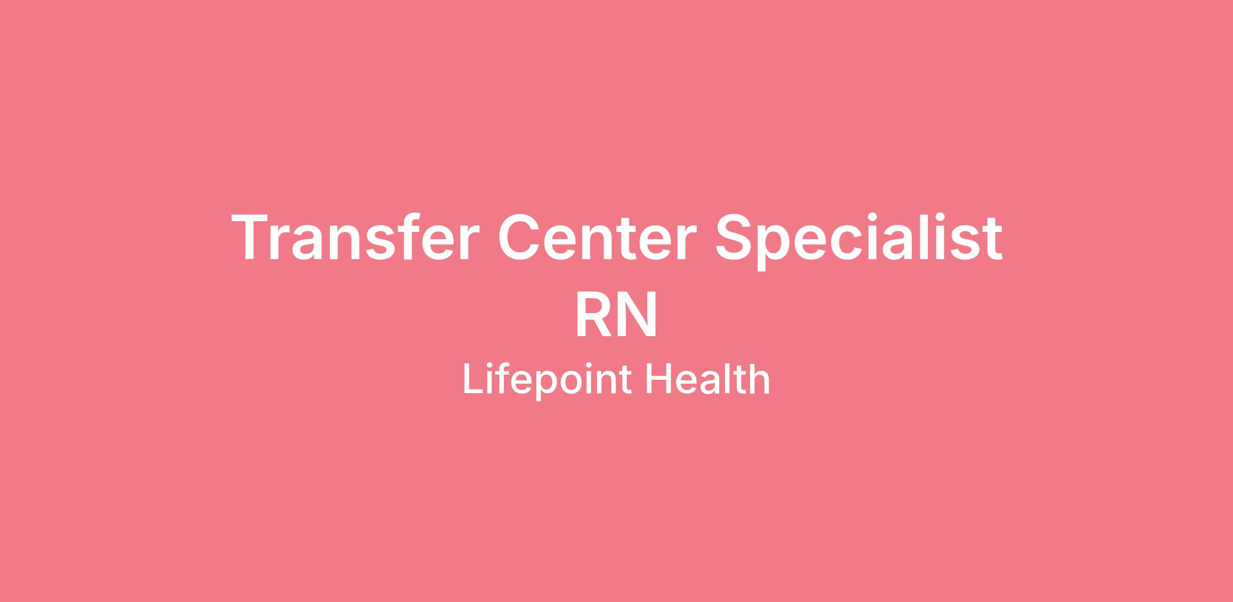 The Transfer Center Specialist II (RN) coordinates the acceptance of patients into LifePoint Health system and facilitates patient transfer process with patients going out of LifePoint Health system to non-LifePoint health system. The Transfer Center Specialist (RN) performs initial admission screening and acceptance using approved clinical criteria to assure patient acceptance and admission are consistent with current protocols and procedures. The Transfer Center Specialist (RN) works in collaboration with multiple departments within the hospital and facilitates relationships with facilities, physicians, and nursing staff. The Transfer Center Specialist (RN) will work closely with the Bed/Capacity Coordinator to identify, trend and report barriers to patient throughput.