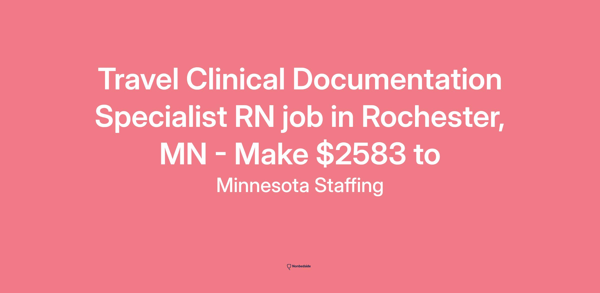 Aya Healthcare has an immediate opening for the following position: Clinical Documentation Specialist Registered Nurse in Rochester, MN. We'll work with you to build the healthcare career of your dreams. Whether you want a job close to home or across the country, we've got you. Pay: $2583/week - $2729/week Assignment Length: 52-week assignment Shift: 5, 8-Hour 08:00 - 17:00 At least one year of experience required.