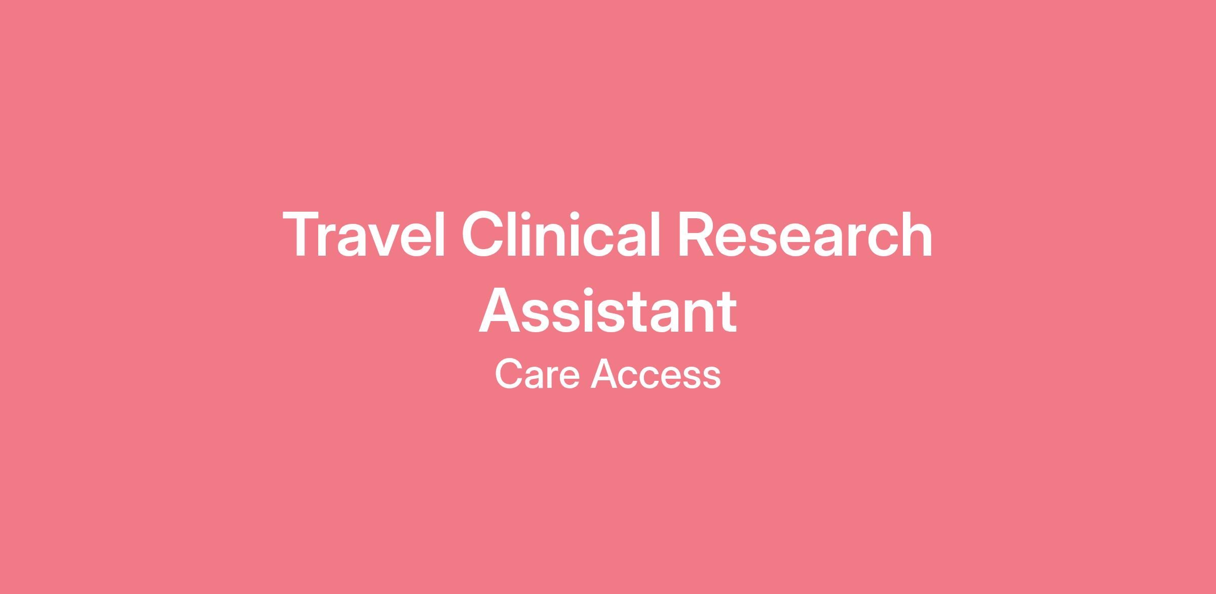The Travel Clinical Research Assistant is an entry level clinical position and is designed to fully integrate the individual in the Care Access Research process while learning the skills necessary to be a Clinical Research Coordinator. This position has potential growth and advancement within the Care Access Research organization.
