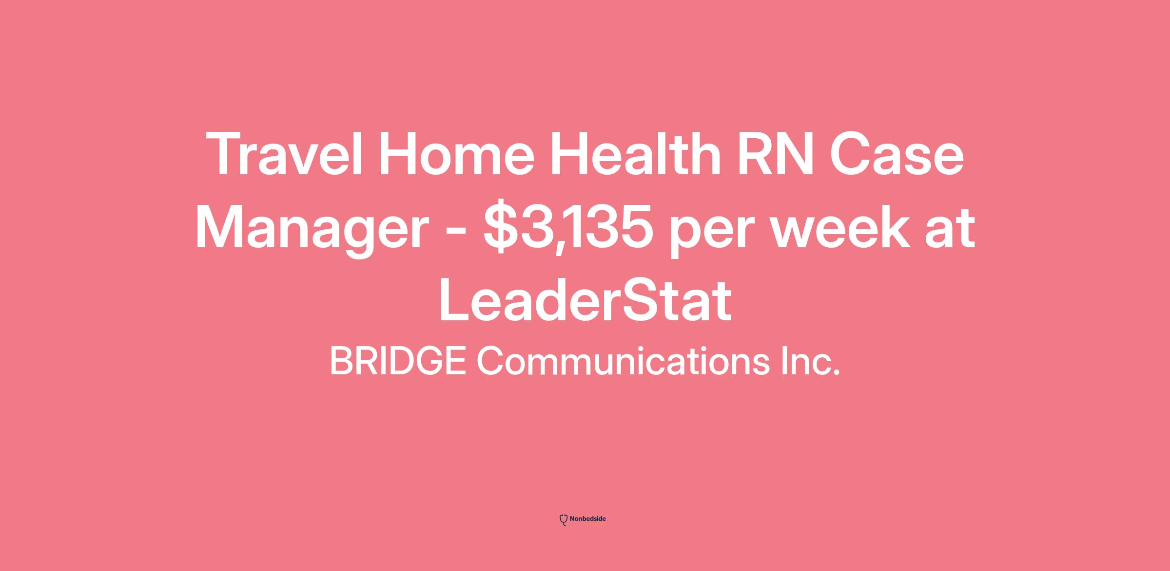 Overview Travel Home Health RN Case Manager - $3,135 per week job at LeaderStat. Barre, VT. LeaderStat is seeking a travel nurse RN Case Manager, Home Health for a travel nursing job in Barre, Vermont.