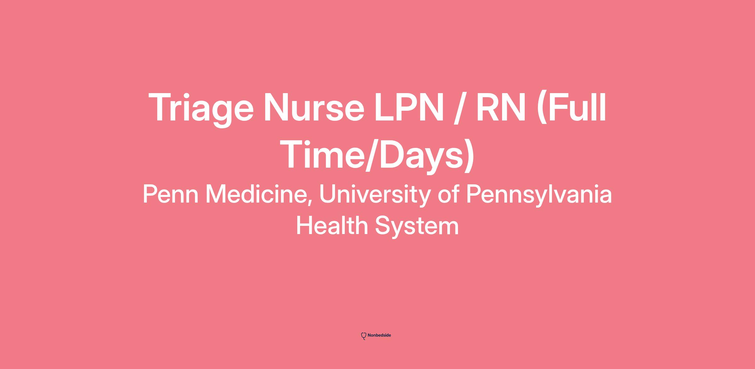 Triage Nurse LPN / RN (Full Time/Days) role at Penn Medicine, University of Pennsylvania Health System . Penn Medicine is dedicated to our tripartite mission of providing the highest level of care to patients, conducting innovative research, and educating future leaders in the field of medicine. Working for this leading academic medical center means collaboration with top clinical, technical and business professionals across all disciplines. Today at Penn Medicine, someone will make a breakthrough. Someone will heal a heart, deliver hopeful news, and give comfort and reassurance. Our employees shape our future each day. Are you living your life's work?