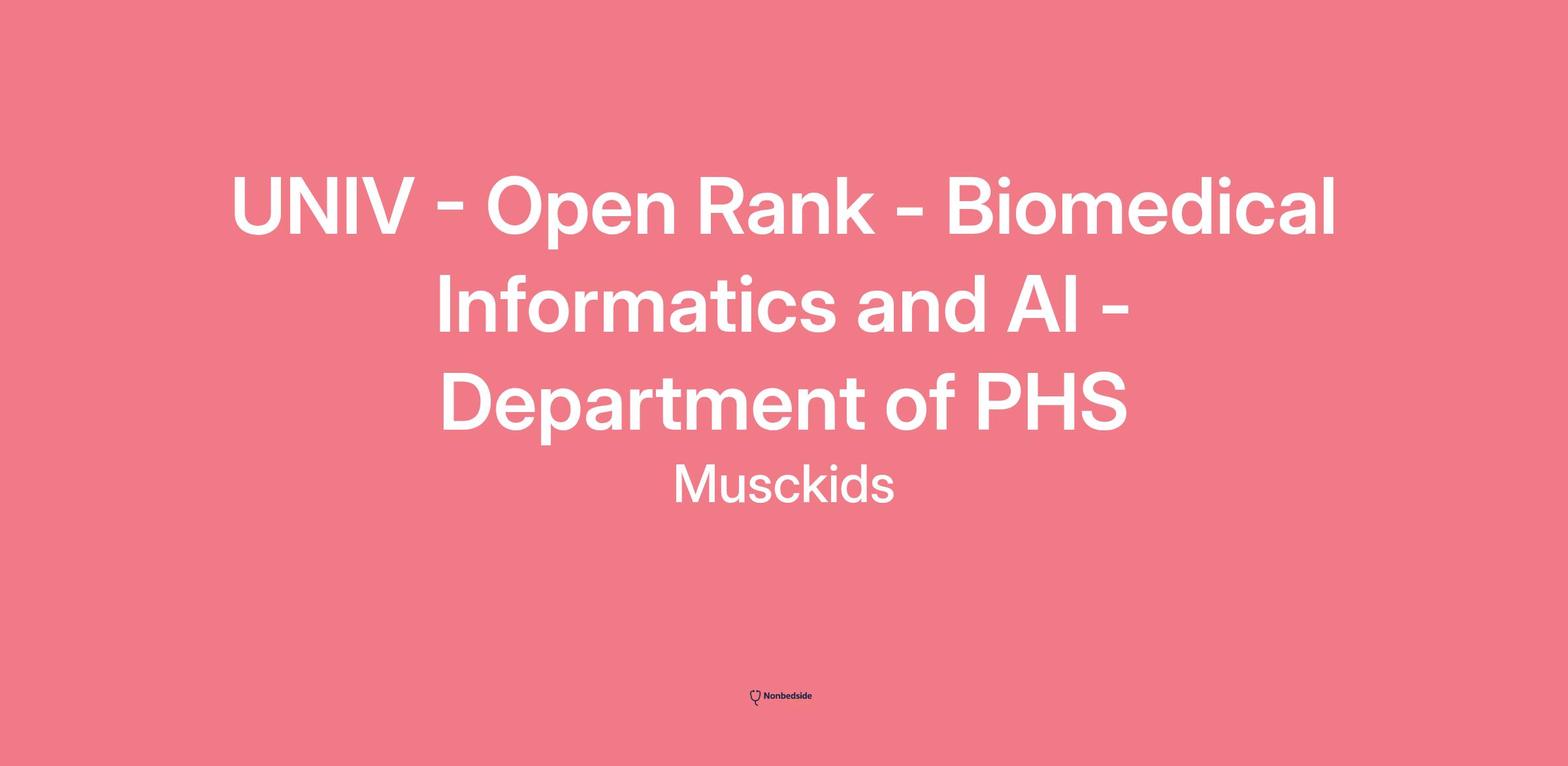 UNIV - Open Rank - Biomedical Informatics and AI - Department of PHS page is loaded## UNIV - Open Rank - Biomedical Informatics and AI - Department of PHSlocations: Charlestontime type: Full timeposted on: Posted Todayjob requisition id: R-0000052576**Job Description Summary**The Division of Biomedical Informatics and AI in the Department of Public Health Sciences at the Medical University of South Carolina (MUSC) College of Medicine invites applications for full-time, tenure-track or non-tenure track open rank faculty positions in the field of biomedical informatics. We seek outstanding candidates with expertise in biomedical informatics methods development and applications, including but not limited to bioinformatics, translational bioinformatics, clinical informatics, clinical research informatics, consumer health informatics, and public health informatics. Candidates with a strong background in Artificial Intelligence and Machine Learning are especially encouraged to apply. Faculty rank and track will be determined based on qualifications and experience.**Entity**Medical University of South Carolina (MUSC - Univ)**Worker Type**Employee**Worker Sub-Type**Faculty**Cost Center**CC000955 COM Biomedical Informatics Center CC**Pay Rate Type**Salary**Pay Grade**University-00**Pay Range**0.00 - 0.00 - 0.000**Scheduled Weekly Hours**40**Work Shift****Job Description****Job Description:**The Division of Biomedical Informatics and AI in the Department of Public Health Sciences at the Medical University of South Carolina (MUSC) College of Medicine invites applications for full-time, tenure-track or non-tenure track open rank faculty positions in the field of biomedical informatics. We seek outstanding candidates with expertise in biomedical informatics methods development and applications, including but not limited to bioinformatics, translational bioinformatics, clinical informatics, clinical research informatics, consumer health informatics, and public health informatics. Candidates with a strong background in Artificial Intelligence and Machine Learning are especially encouraged to apply. Faculty rank and track will be determined based on qualifications and experience.**Key Responsibilities:*** Develop and maintain an independent, externally funded research program in biomedical informatics and/or AI.* Collaborate across MUSC’s academic and clinical units to advance AI and informatics-driven research and education.* Teach and mentor students in biomedical data science and informatics PhD and MS programs.* Contribute to informatics and data science education across biomedical and health sciences graduate programs.* If applicable, participate in clinical activities aligned with the candidate’s specialty with agreement of the relevant clinical department chair.**Qualifications:*** PhD, MD, or equivalent degree in biomedical informatics, computer science, data science, or a related field.* Demonstrated research productivity and potential for securing independent funding.* Commitment to excellence in teaching, mentoring, and interdisciplinary collaboration.**Preferred Research Areas:*** Biomedical informatics methods and applications* Artificial Intelligence and Machine Learning in health care* Translational bioinformatics and clinical research informatics* Public health informatics and consumer health technologies**Start-Up and Support:** Successful candidates will receive a competitive start-up package, including dedicated research space, access to core facilities, and administrative support for grant development. MUSC is committed to fostering faculty development through mentorship, interdisciplinary collaboration, and integration with clinical and translational research initiatives.**About the Division of Biomedical Informatics and AI:** Located within the Department of Public Health Sciences, the Division of Biomedical Informatics and AI is a dynamic and growing unit at MUSC focused on advancing data-driven health research and education. MUSC is a premier academic medical center located in Charleston, SC, with nationally recognized programs in biomedical research, informatics, and health innovation.**Application Instructions:** Applicants should submit:* A cover letter outlining research interests and vision, including potential applications of informatics and AI in health.* Curriculum vitae* Research statement (2–3 pages)* Teaching statement (optional)* Contact information for at least three referencesInquiries may be directed to Marylyn Ritchie, PhD, Associate Dean for AI and Director, Division of Biomedical Informatics and AI, at ritchiem@musc.edu**Additional Job Description**Physical Requirements: (Note: The following descriptions are applicable to this section: Continuous - 6-8 hours per shift; Frequent - 2-6 hours per shift; Infrequent - 0-2 hours per shift) Ability to perform job functions in an upright position. (Frequent) Ability to perform job functions in a seated position. (Frequent) Ability to perform job functions while walking/mobile. (Frequent) Ability to work indoors. (Continuous) Ability to work outdoors in all weather and temperature extremes. (Infrequent) Ability to work in confined/cramped spaces. (Infrequent) Ability to perform job functions from kneeling positions. (Infrequent) Ability to squat and perform job functions. (Infrequent) Ability to perform 'pinching' operations. (Infrequent) Ability to fully use both hands/arms. (Frequent) Ability to perform repetitive motions with hands/wrists/elbows and shoulders. (Frequent) Ability to reach in all directions. (Frequent) Possess good finger dexterity. (Continuous) Ability to maintain tactile sensory functions. (Continuous) Ability to lift and carry 15 lbs., unassisted. (Infrequent) Ability to lift objects, up to 15 lbs., from floor level to height of 36 inches, unassisted. (Infrequent) Ability to lower objects, up to 15 lbs., from height of 36 inches to floor level, unassisted. (Infrequent) Ability to push/pull obje