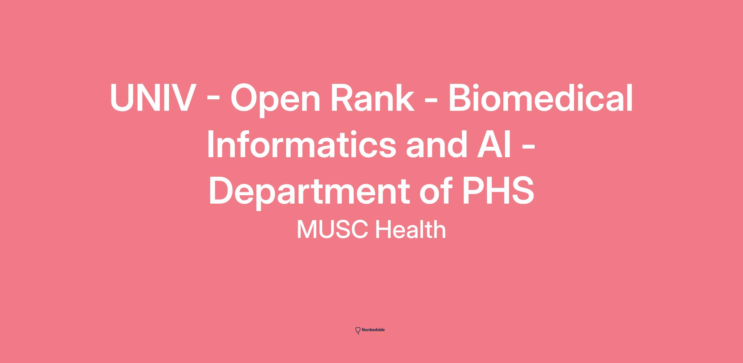 Overview The Division of Biomedical Informatics and AI in the Department of Public Health Sciences at the Medical University of South Carolina (MUSC) College of Medicine invites applications for full-time, tenure-track or non-tenure track open rank faculty positions in the field of biomedical informatics. We seek outstanding candidates with expertise in biomedical informatics methods development and applications, including but not limited to bioinformatics, translational bioinformatics, clinical informatics, clinical research informatics, consumer health informatics, and public health informatics. Candidates with a strong background in Artificial Intelligence and Machine Learning are especially encouraged to apply. Faculty rank and track will be determined based on qualifications and experience.
