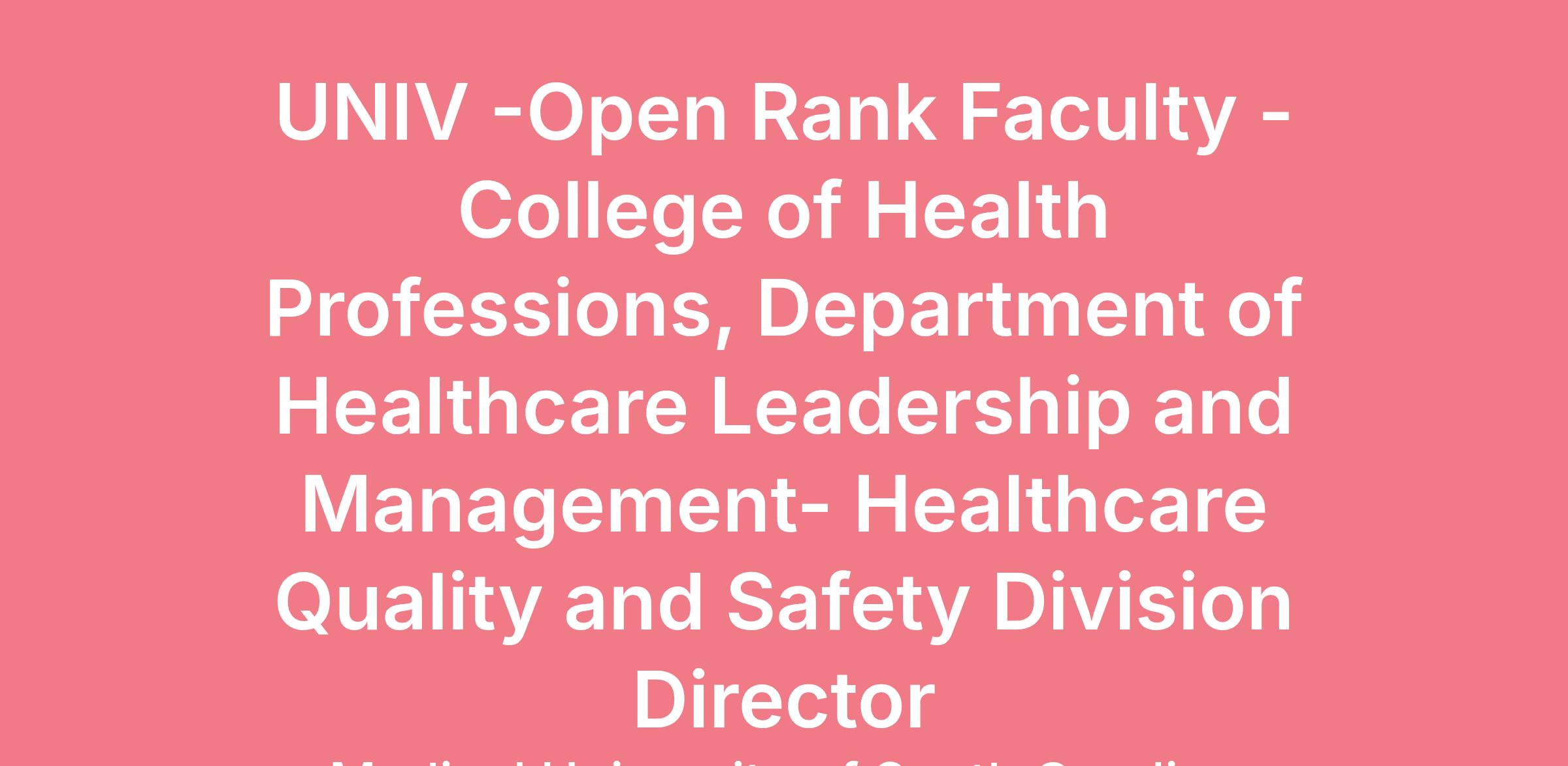 The Department of Healthcare Leadership and Management at the Medical University of South Carolina (MUSC) invites applications for the role of Division Director – Master of Science in Healthcare Quality & Safety, referred to hereafter as Division Director. This is a full-time faculty position with administrative responsibilities, offered on the academic educator track (tenure eligible) with rank and salary commensurate with qualifications and experience.Entity