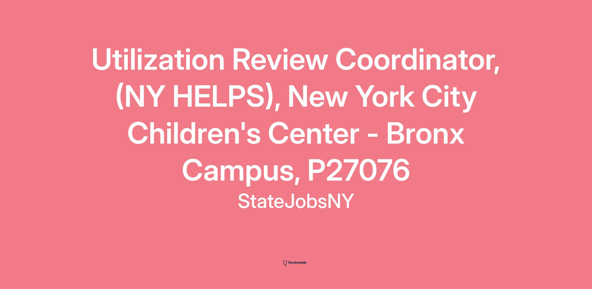 New York City Children's Center Bronx Campus is recruiting for a Utilization Review Coordinator to analyze and evaluate quality, effectiveness, and efficiency of psychiatric and medical services provided to individuals diagnosed with mental illness. Candidates from outside or within State Service can apply.