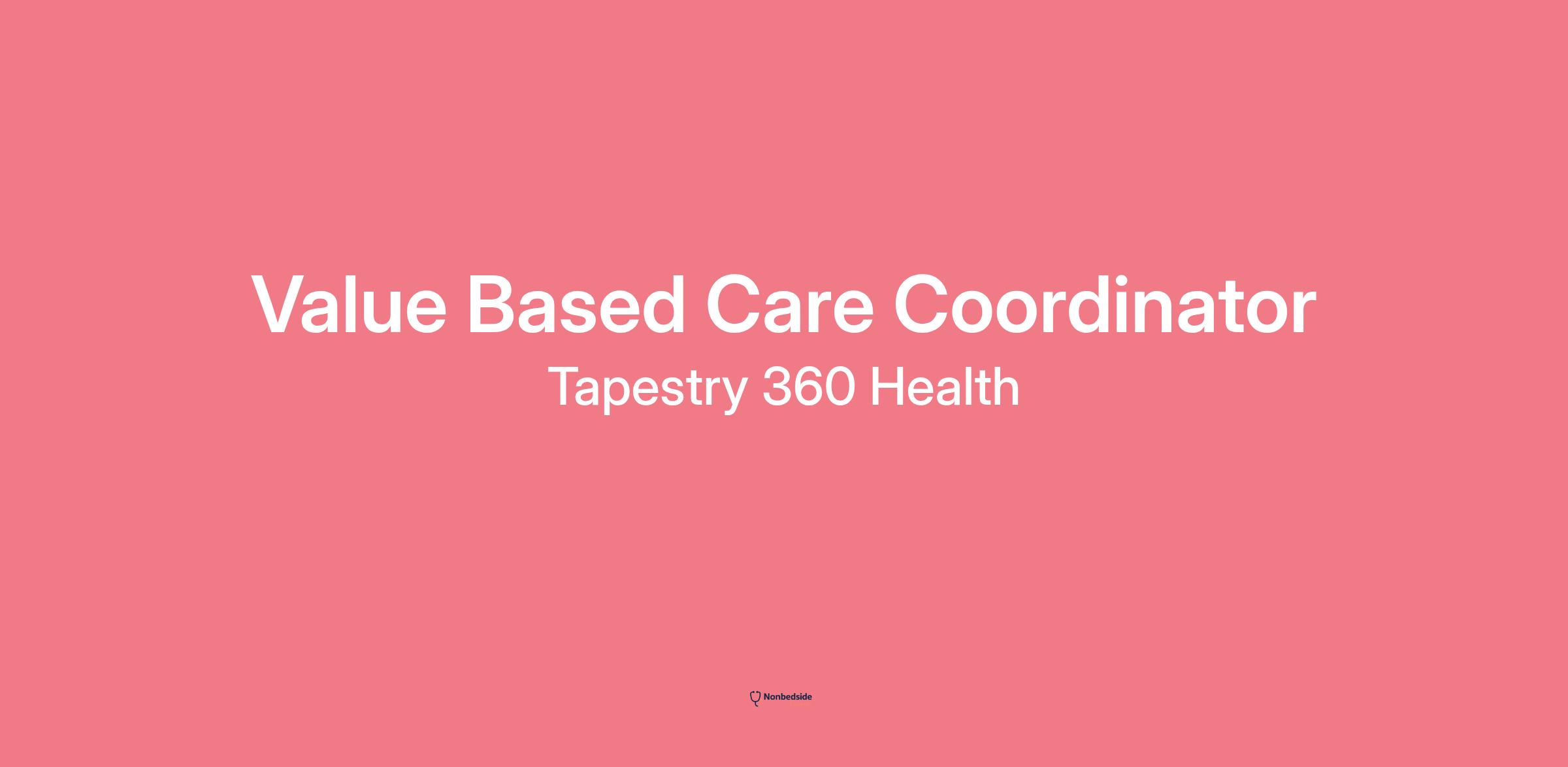 Overview Value Based Care Coordinator role at Tapestry 360 Health. The Value Based Care Coordinator plays a critical role in improving patient outcomes and supporting value-based care and payment metrics. This position manages hospital admission, discharge, and transfer processes and ensures seamless coordination of care for patients transitioning from hospital to home or other care settings. The role involves assisting with projects, initiatives, and outreach to support achieving performance in accordance with value-based contracts.