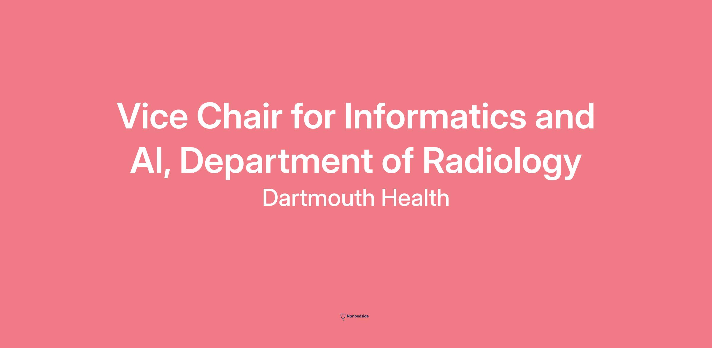We are seeking a skilled, visionary, and impactful radiologist leader to define and execute a vision for integrating cutting-edge IT and AI systems built into a dynamic Department of Radiology. Responsibilities for the role include building and executing on an overall strategy for IT systems, informatics infrastructure, and AI used by Radiologists and other radiology staff. The Radiology Vice Chair of Informatics and AI will also serve a central role at the system level by virtue of the Department generating the vast majority of medical imaging at the institution. Dartmouth Health Radiology interprets imaging from 10 hospitals and a number of out-patient imaging centers, so the reach of the Department and the VC role is wide.
