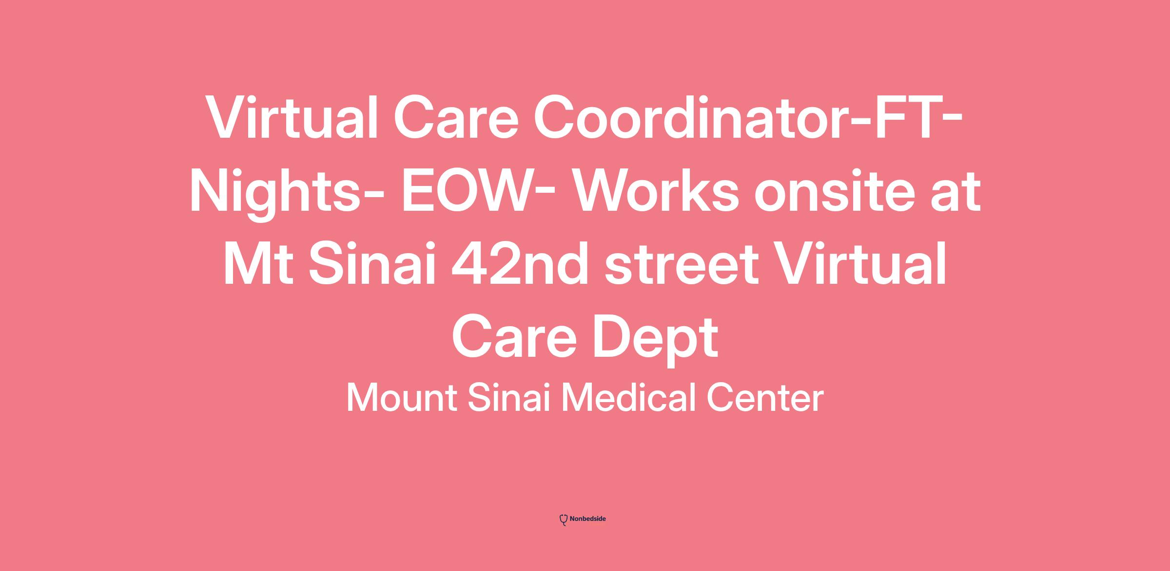 Description As an integral part of a team, the Virtual Care Coordinator is responsible for supporting virtual patient care activities and promoting patient focused care within the Mount Sinai Health System. This role is responsible for performing various remote monitoring duties involving, but not limited to, patient monitoring for safety and clinical needs, providing support and assistance with hospital-based tele services, and monitoring of hospital environmental status. The Virtual Care Coordinator will collaborate on implementing planned telehealth and remote patient monitoring programs, collaborate with leadership to coordinate training, and participate in development and execution of telehealth best practices. Role includes administrative tasks and requires clear communication and collaboration with clinical team, patients, Digital Technology Partners, engineering, telehealth platform vendors and other associated managerial duties. Shares accountability for clinical quality and safety outcomes.